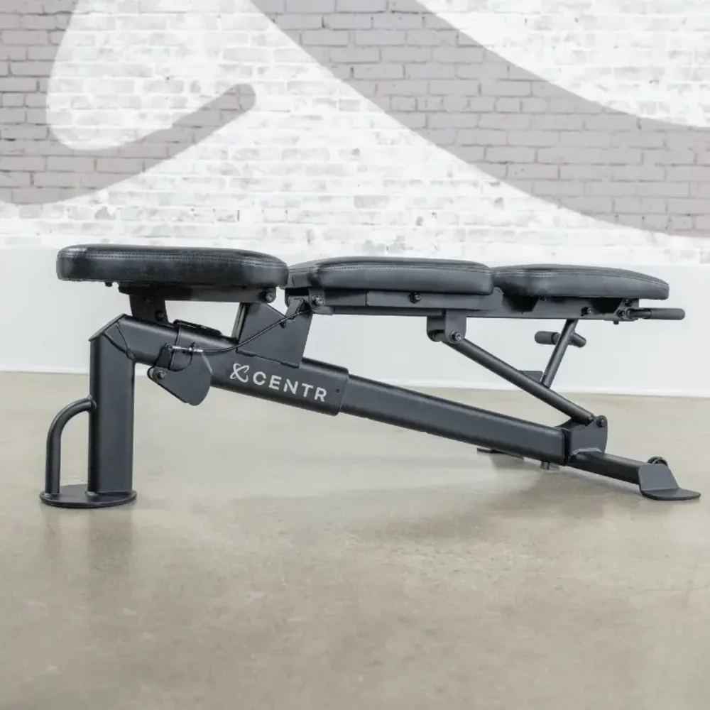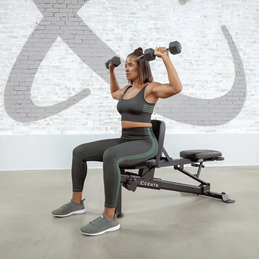 Această bancă de antrenament multifuncțională este complementul perfect pentru orice sală de sport de acasă. Concepută pentru versatilitate, această bancă de antrenament are o pernă de spătar reglabilă în 7 poziții, tip scară, de la -15° înclinare la 75° înclinare, o reglare a scaunului în 4 poziții, de la 0° la 30°, și un suport unic pentru spătarul central în 4 poziții. Aceasta înseamnă că ai nevoie doar de o bancă pentru a efectua totul, de la exerciții cu gantere la antrenamente funcționale cu aparate cu cablu. Ajustează rapid perna de spătar central cu ajutorul unui mâner de reglare de la distanță pentru a ajunge într-o nouă poziție și a te bucura de un antrenament eficient cu gantere și haltere. Banca de antrenament multi-reglabilă Centr oferă, de asemenea, acces la programe de antrenament personalizate în aplicația Centr.